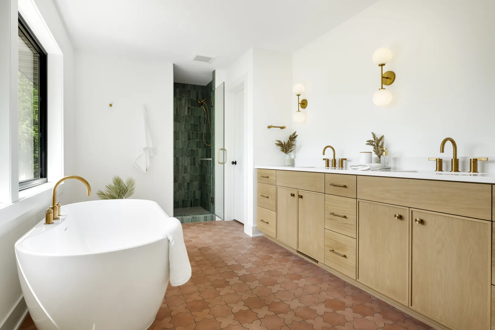 • Tranquil primary suite with luxury spa bath including freestanding tub, spacious ceramic tile shower, separate vanities & dressing vanity