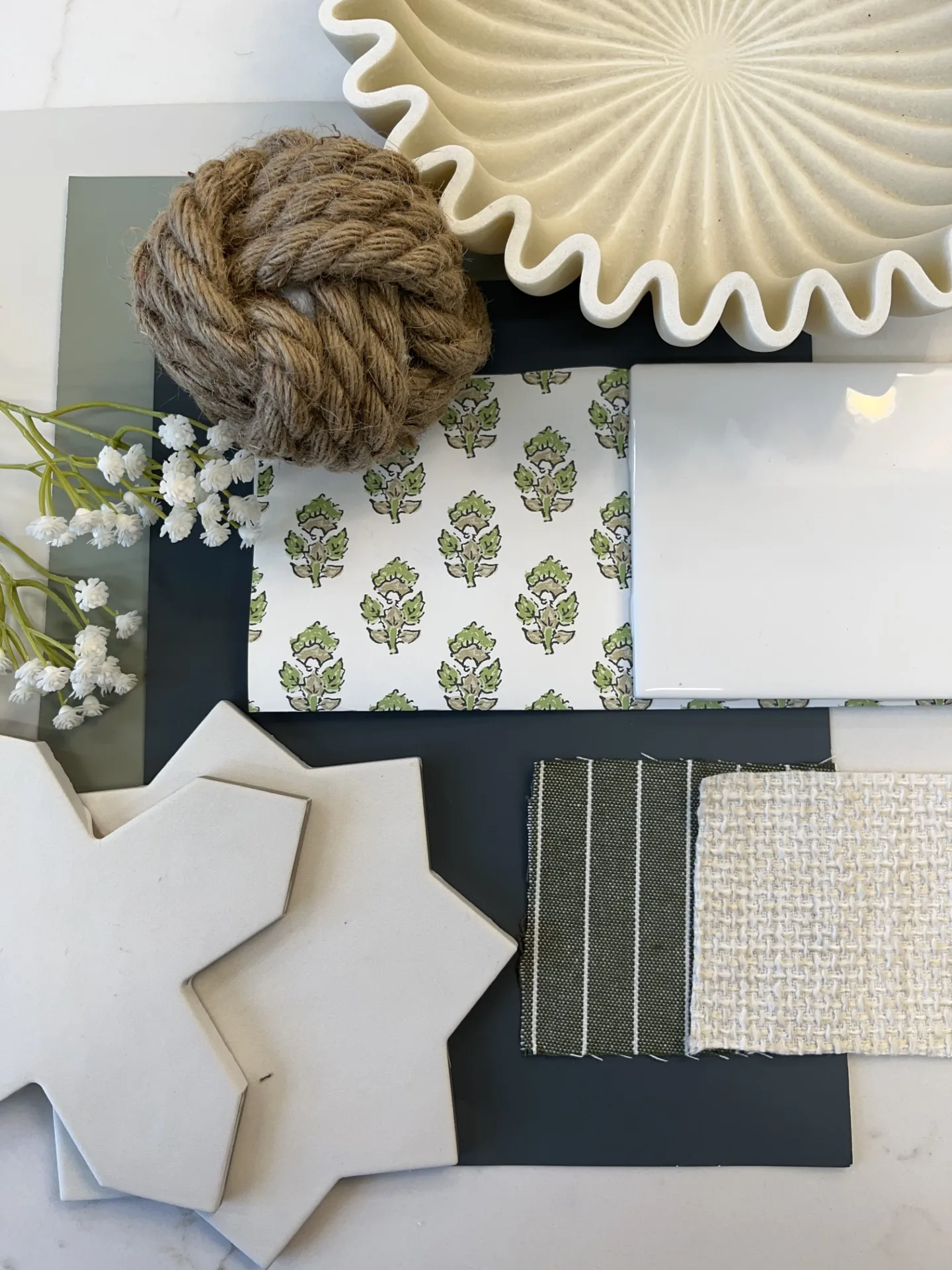A soft blend of sage green, creamy neutrals, and crisp white creates a timeless palette with a touch of coastal charm. Natural rope and textured fabrics add warmth and dimension, while the floral print and star-shaped tile bring a playful, handcrafted touch — the perfect balance of tailored and relaxed living.