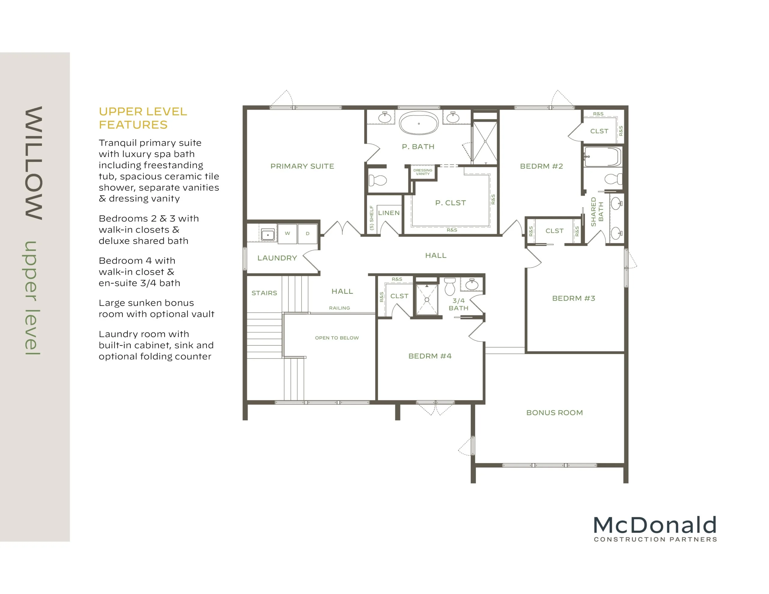 • Upper level primary suite with luxury spa bath featuring freestanding tub, oversized ceramic tile shower, separate vanities & dressing counter