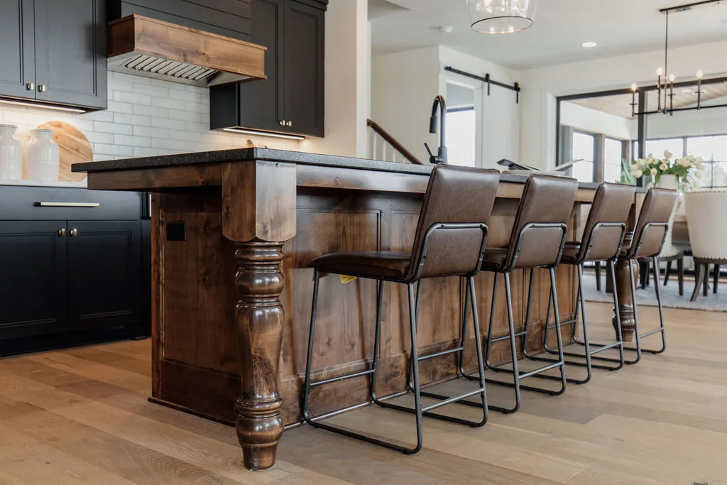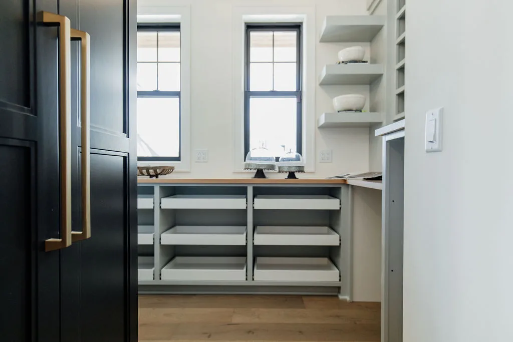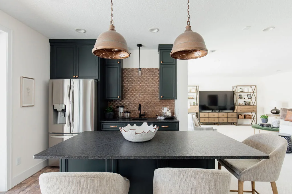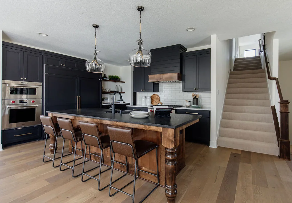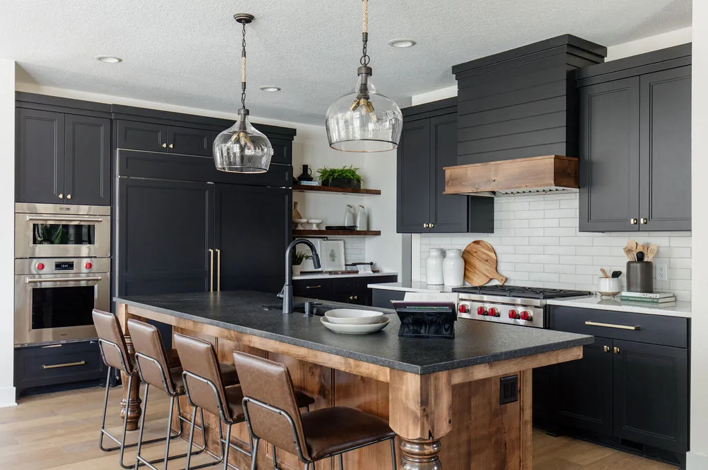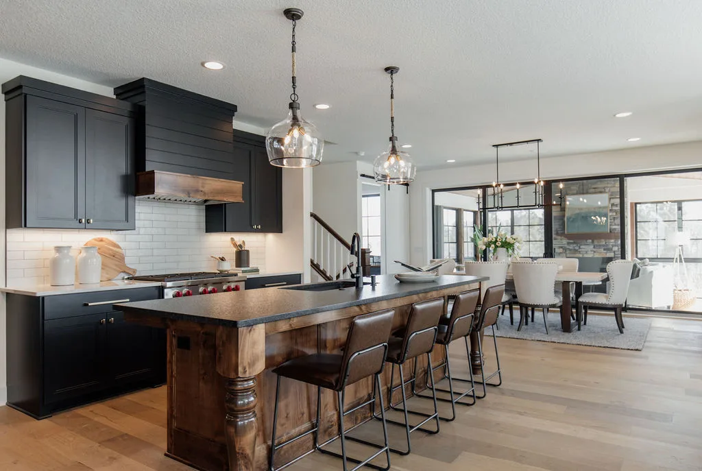 The kitchen features black painted cabinetry, an oversized island and a hidden pantry with a coffee bar. The rear dining room opens to the screened porch with fireplace.