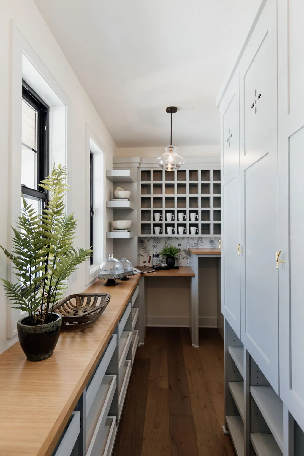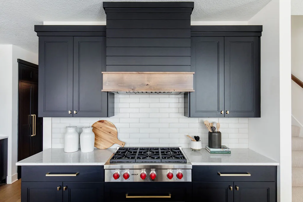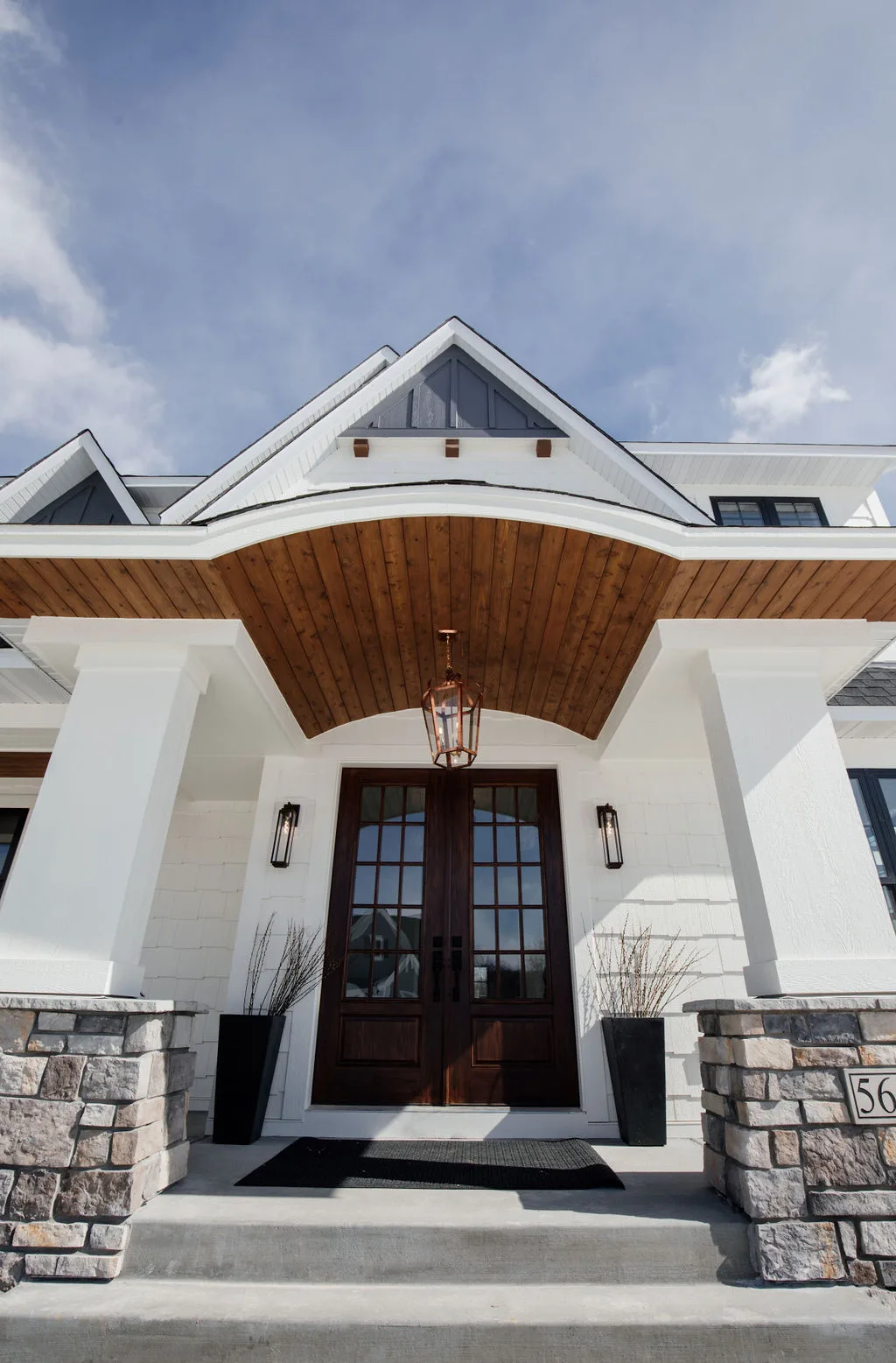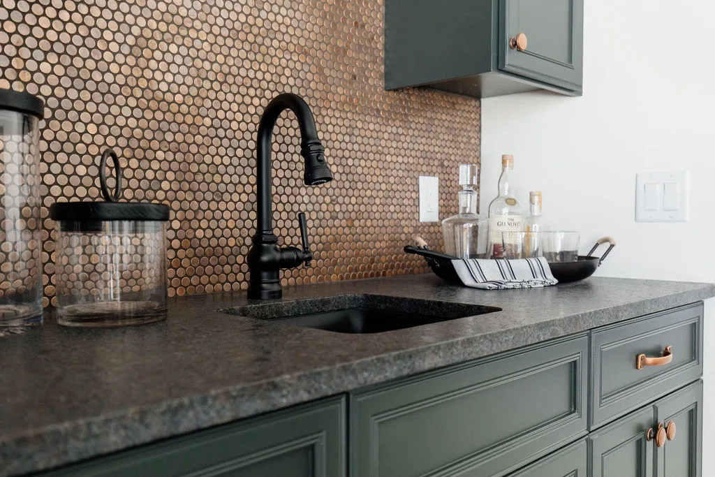 The kitchen features black painted cabinetry, an oversized island and a hidden pantry with a coffee bar. The rear dining room opens to the screened porch with fireplace.