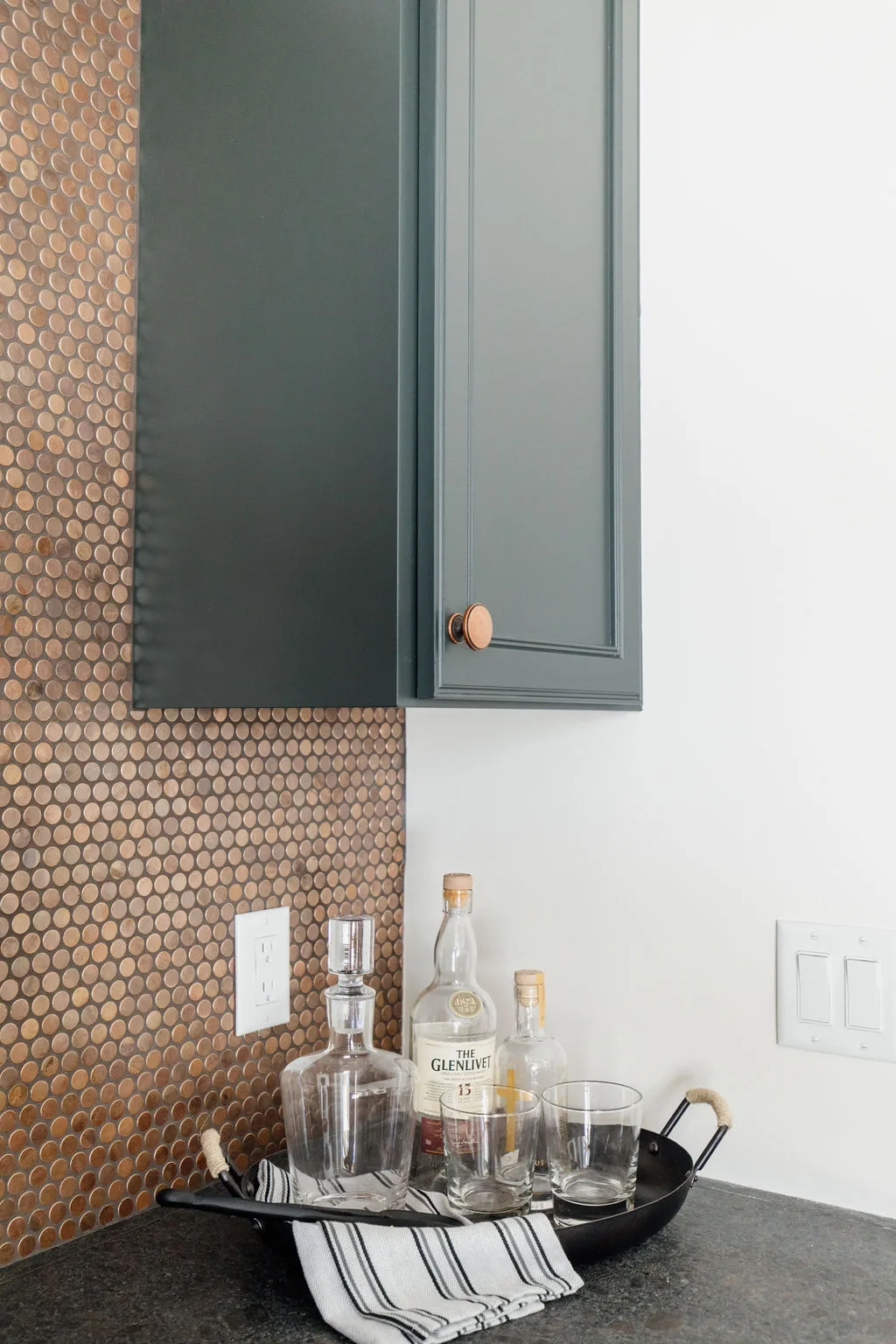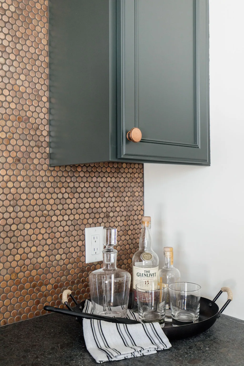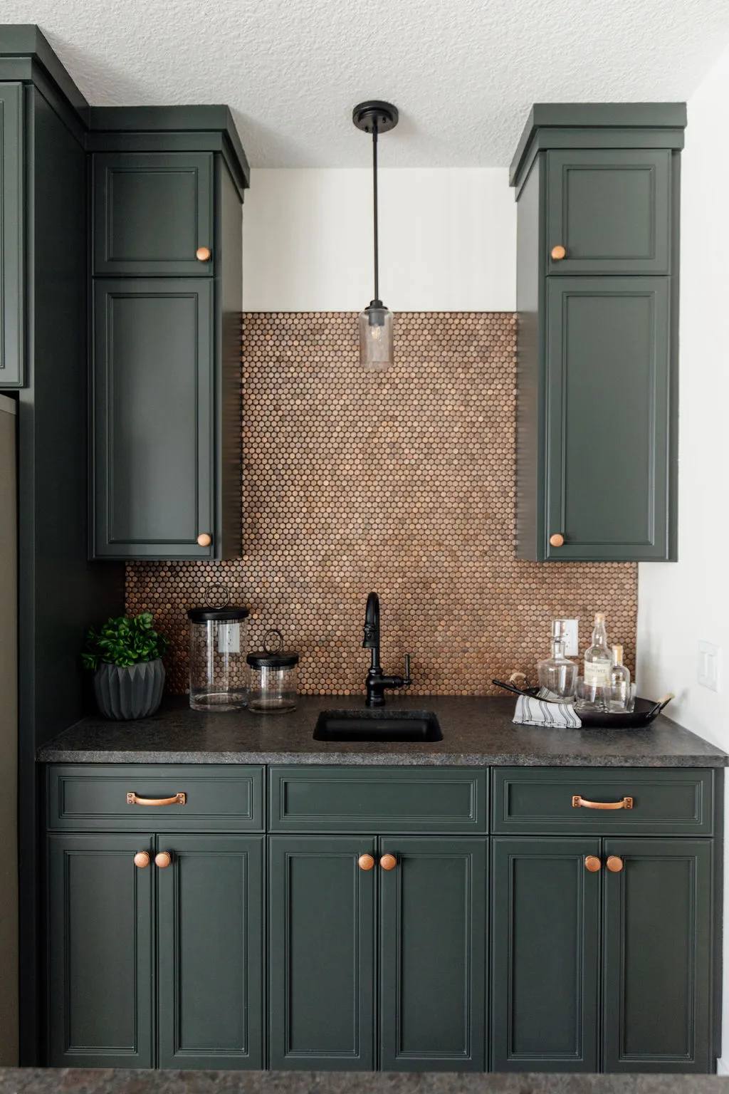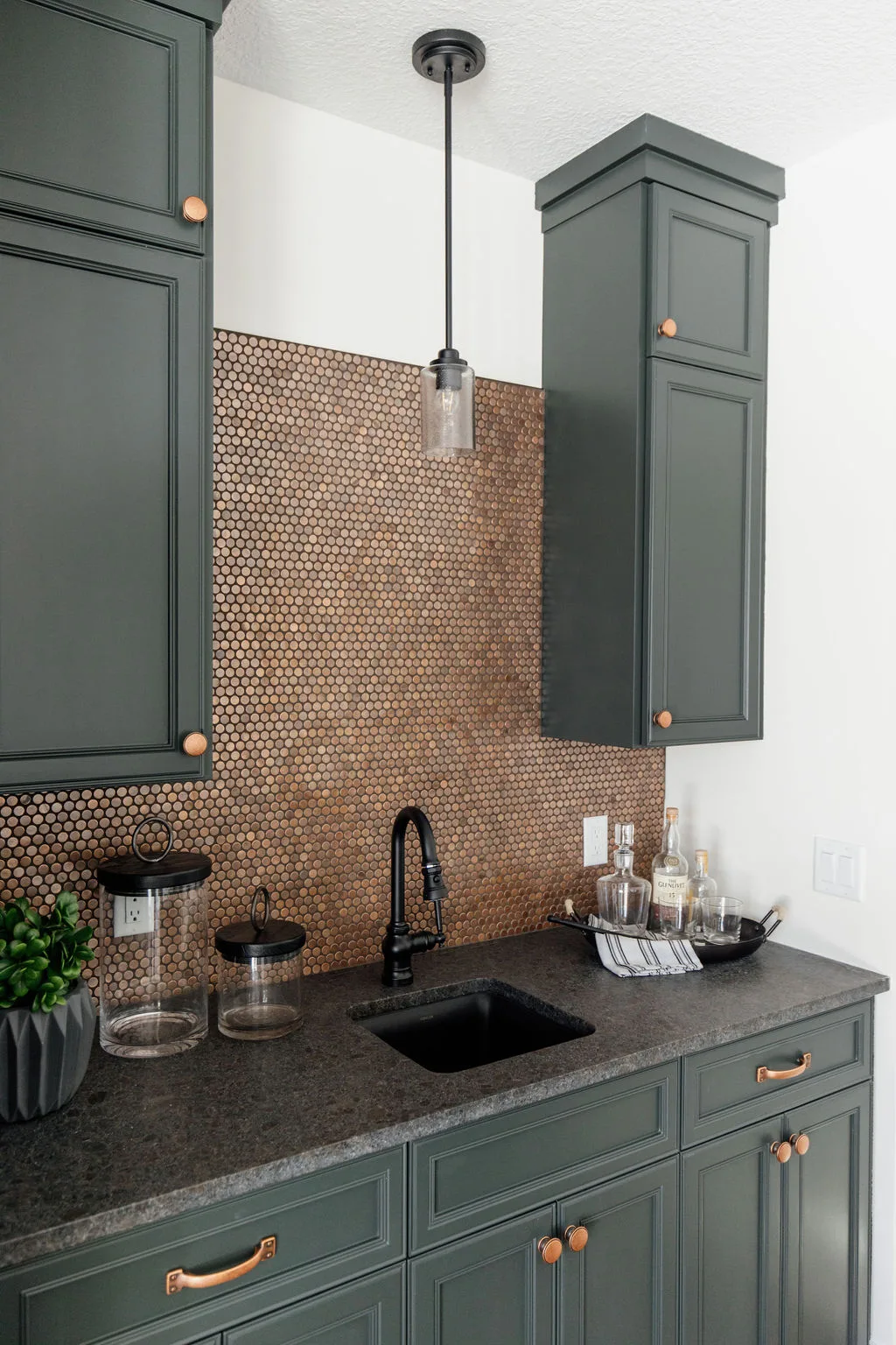 The kitchen features black painted cabinetry, an oversized island and a hidden pantry with a coffee bar. The rear dining room opens to the screened porch with fireplace.