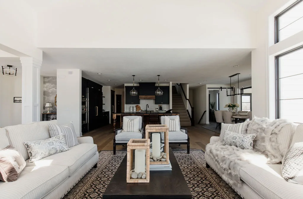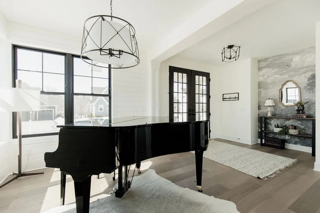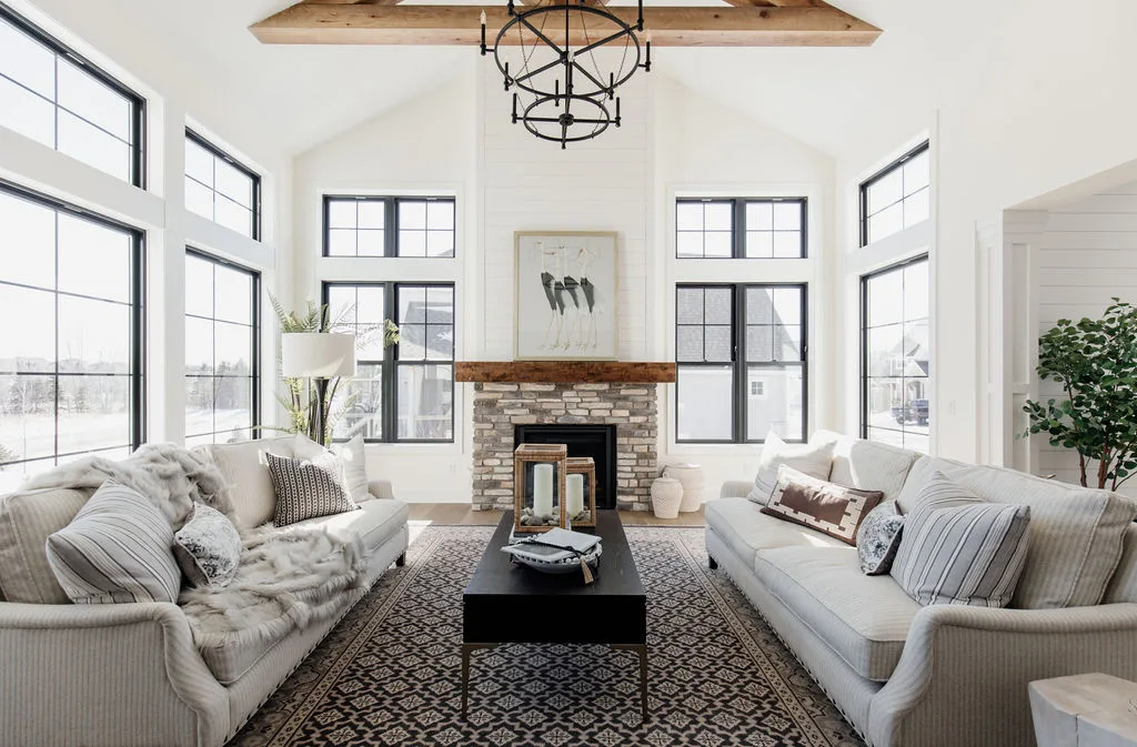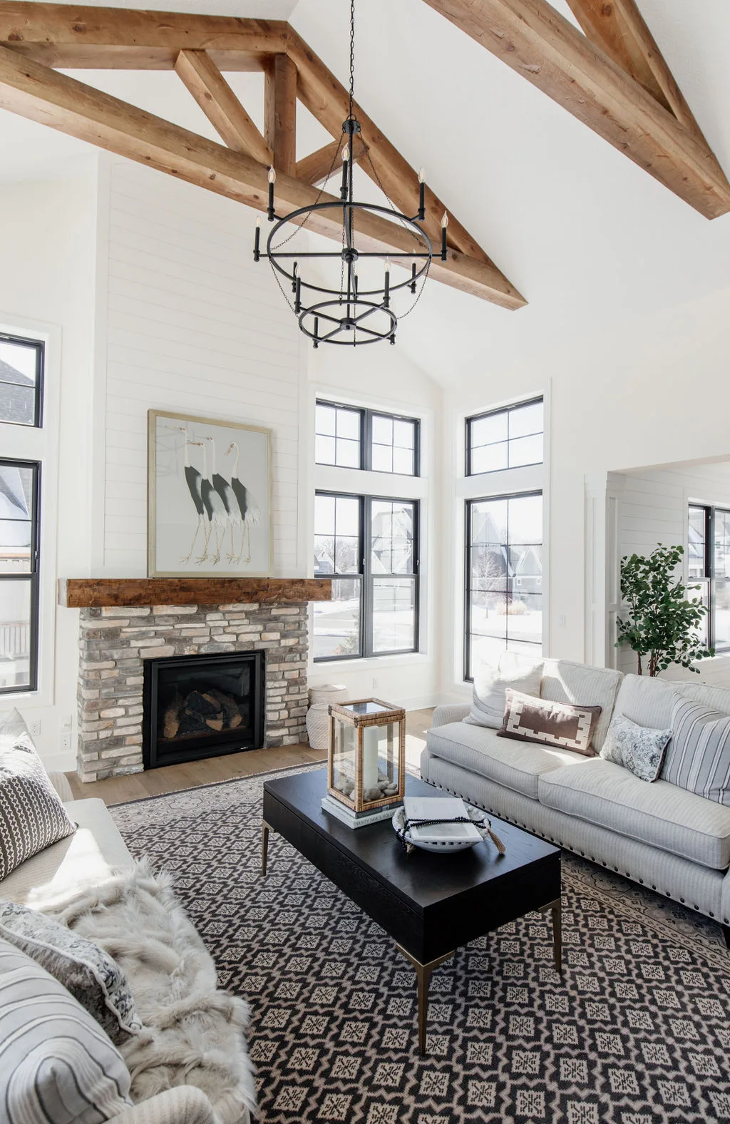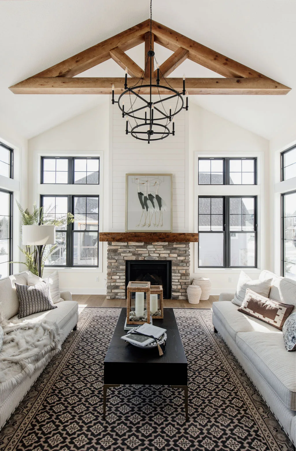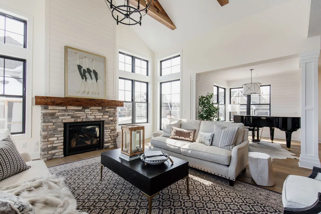 French oak floors flow through the main floor with a vaulted great room with beams, black windows, shiplap fireplace, and clean white walls.