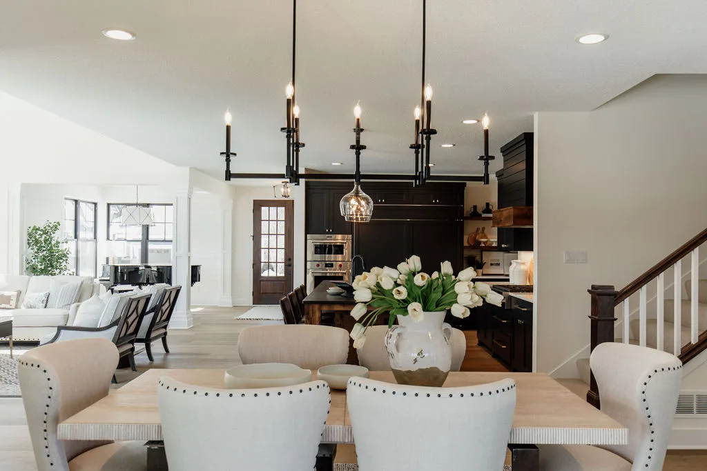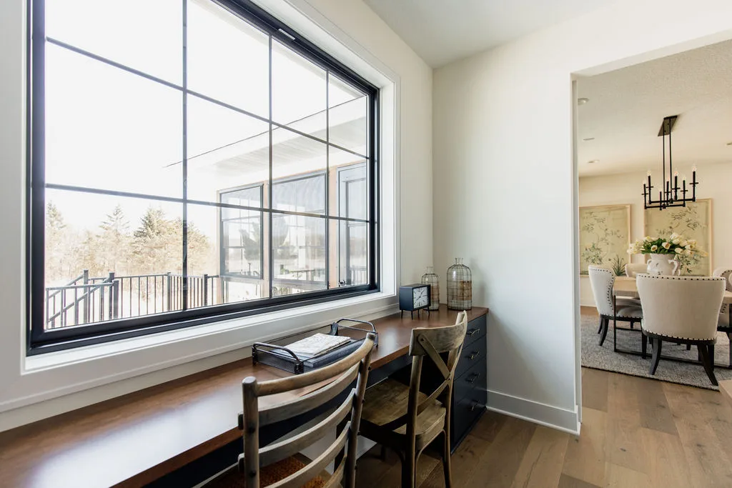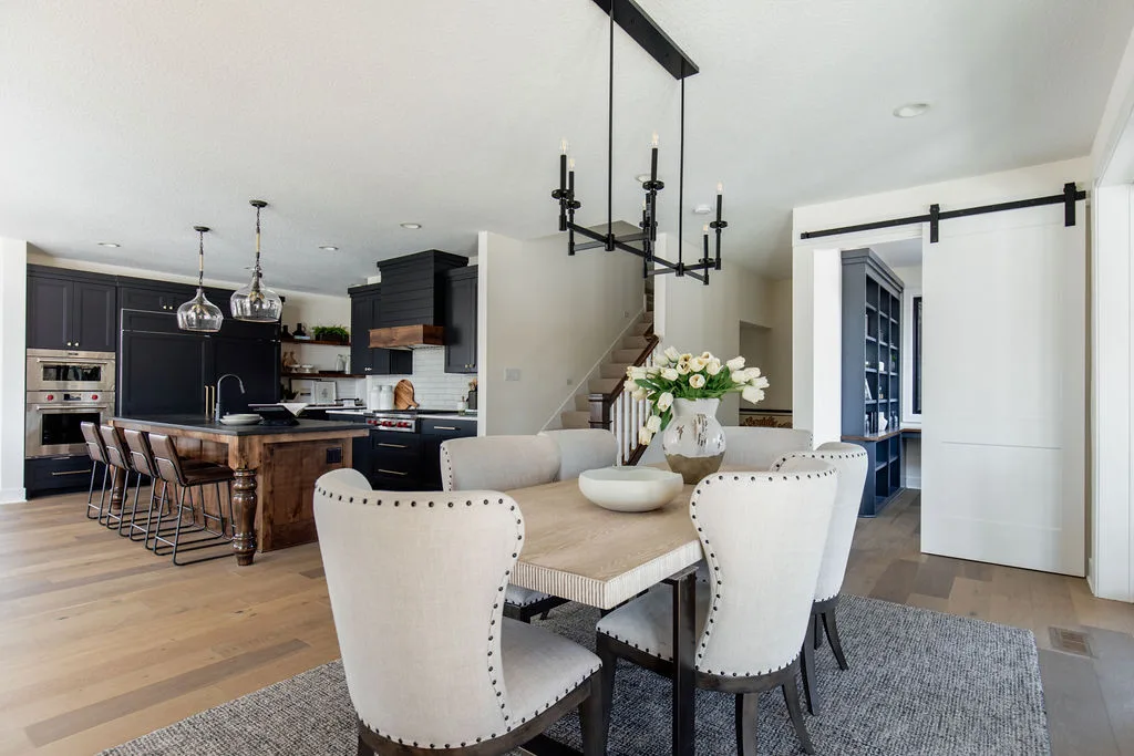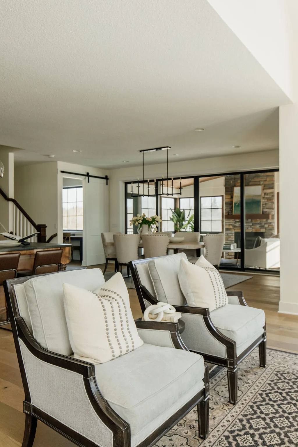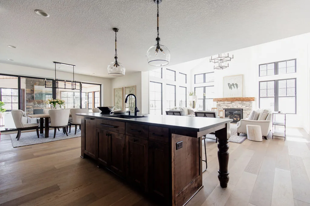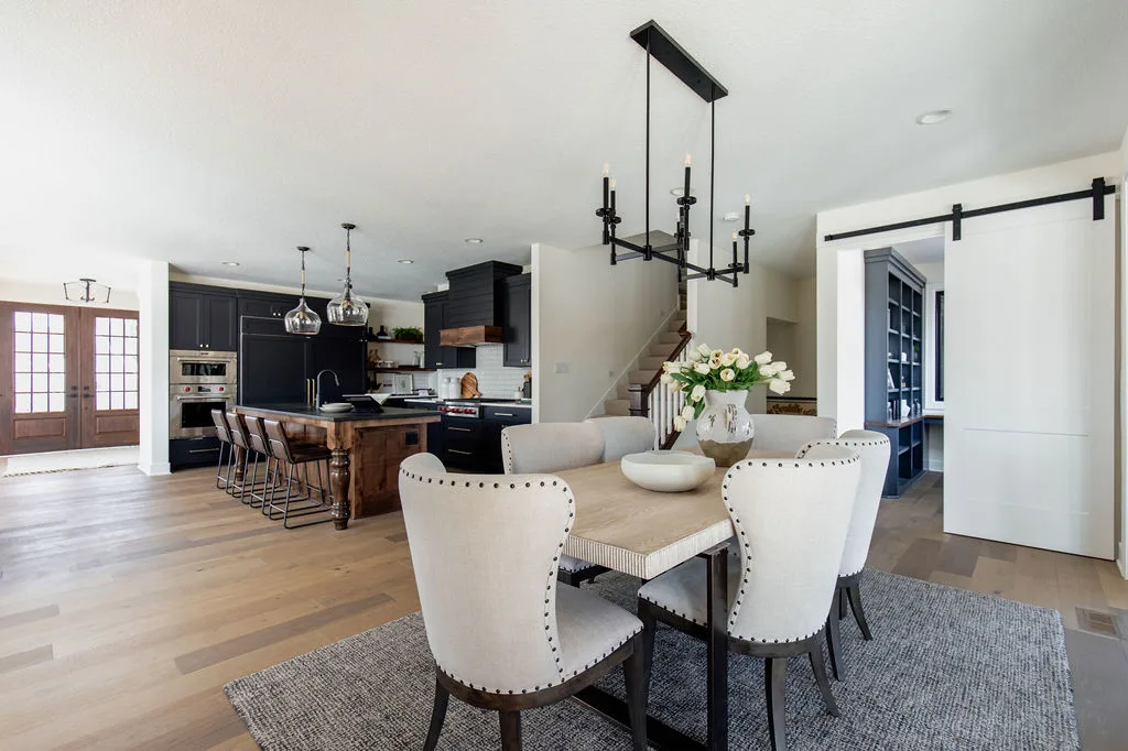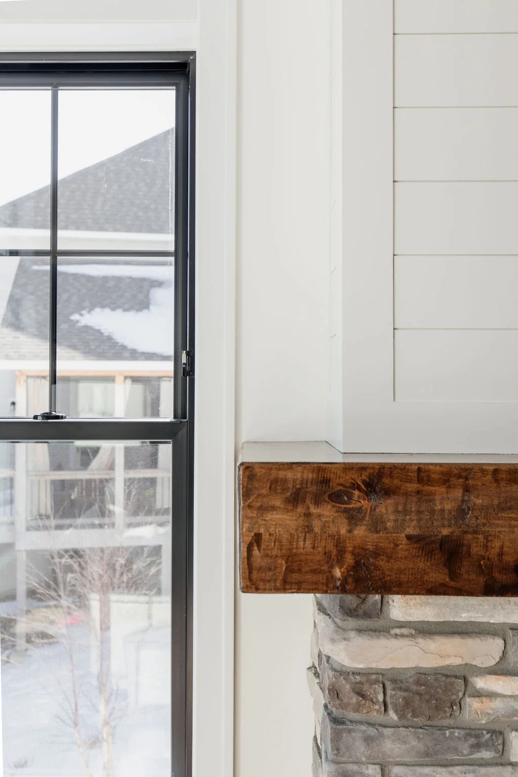 French oak floors flow through the main floor with a vaulted great room with beams, black windows, shiplap fireplace, and clean white walls.