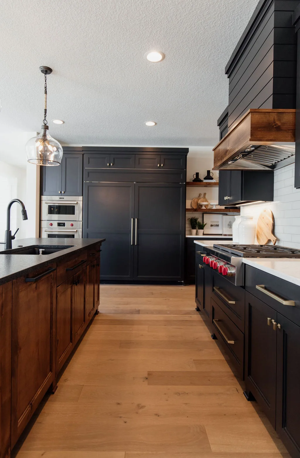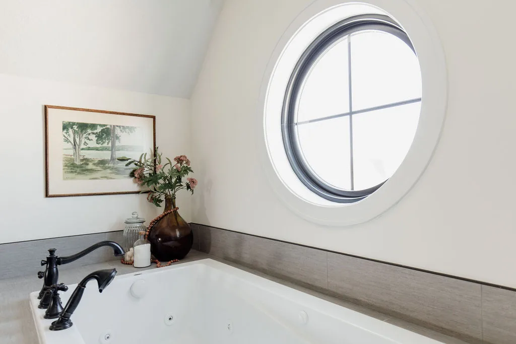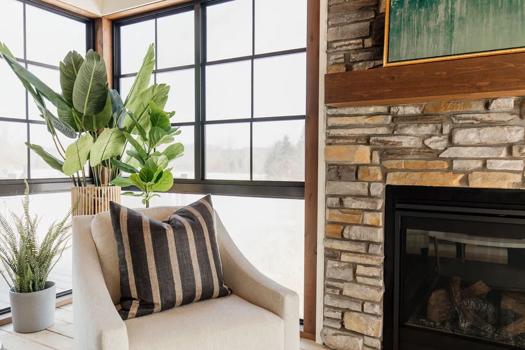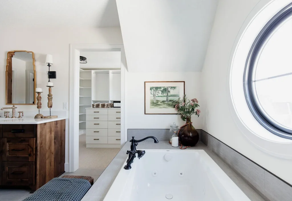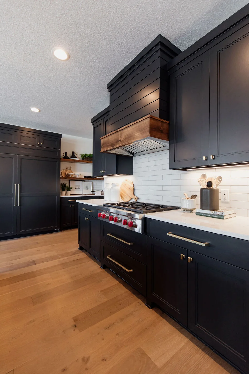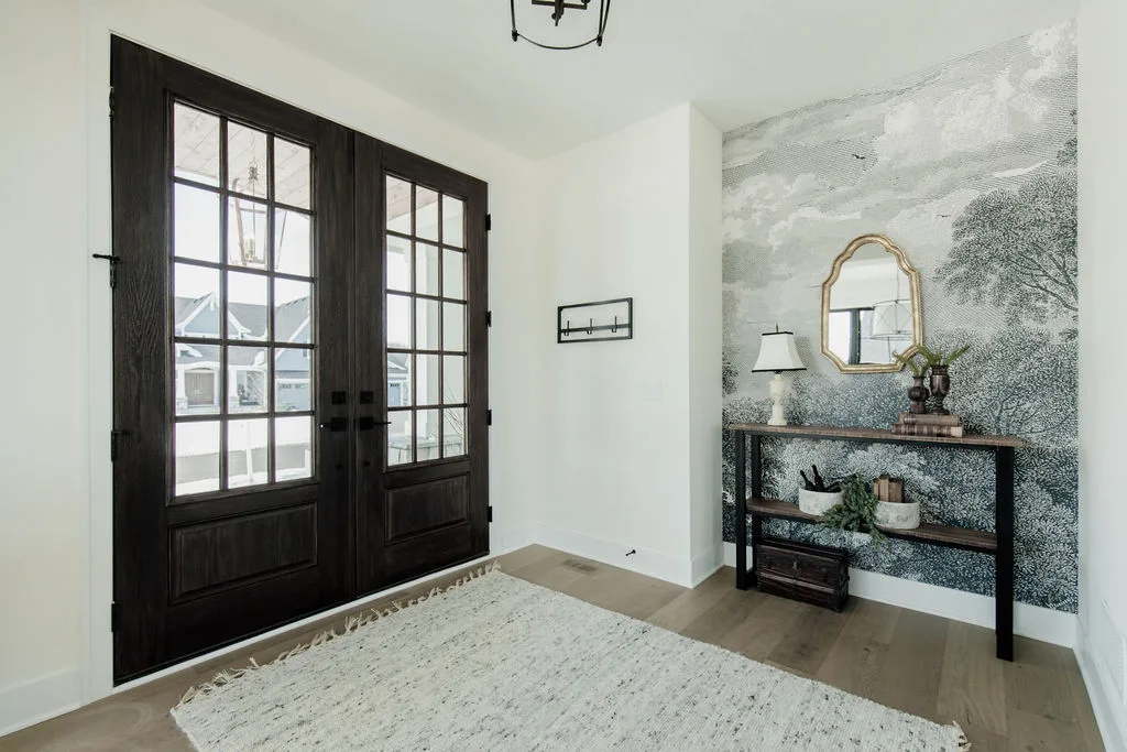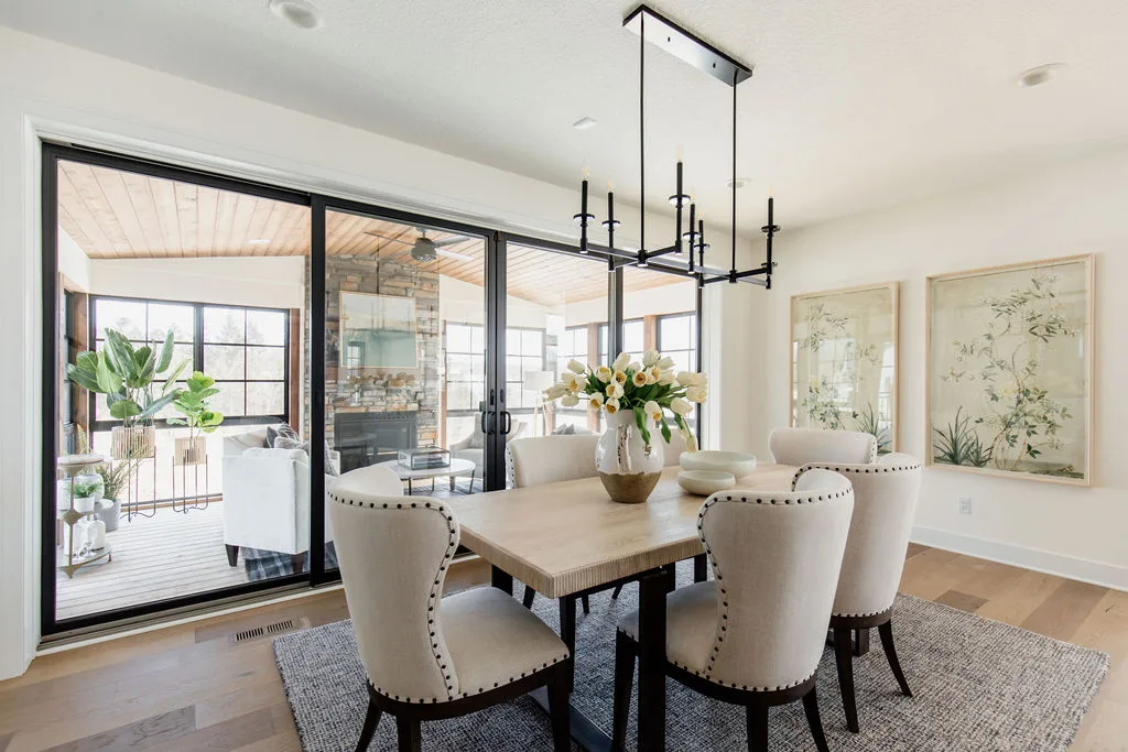 French oak floors flow through the main floor with a vaulted great room with beams, black windows, shiplap fireplace, and clean white walls.
