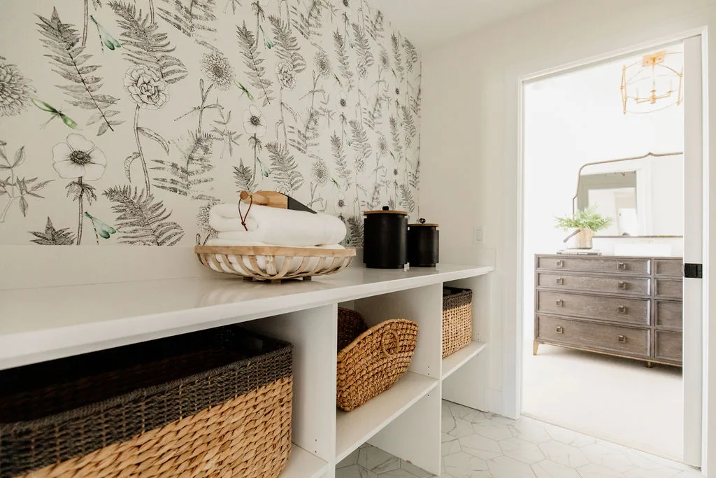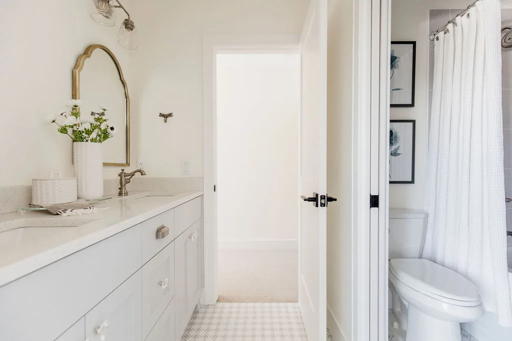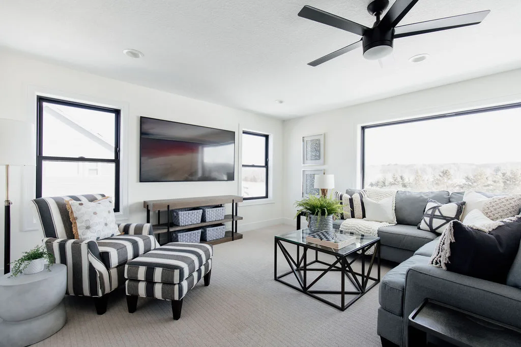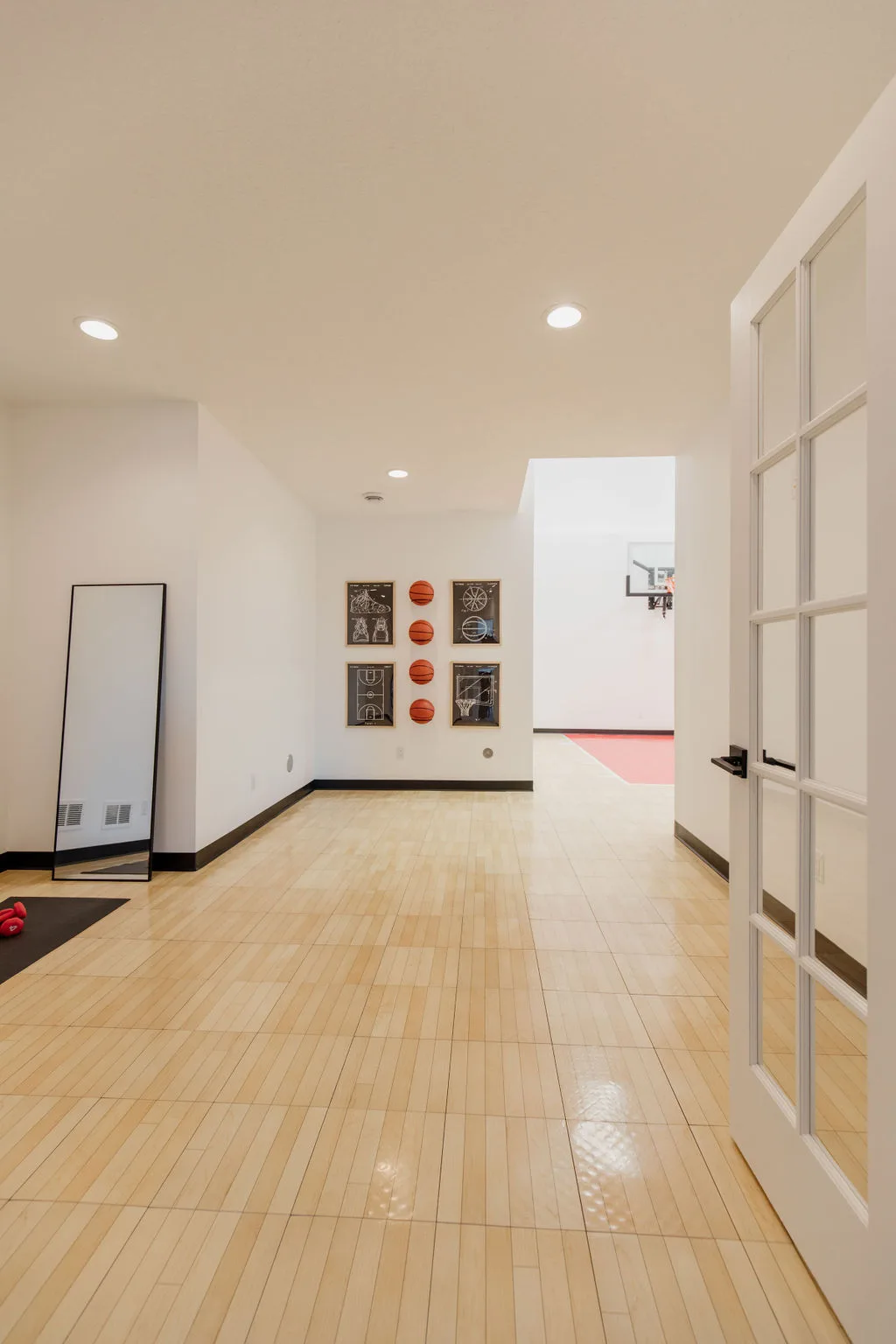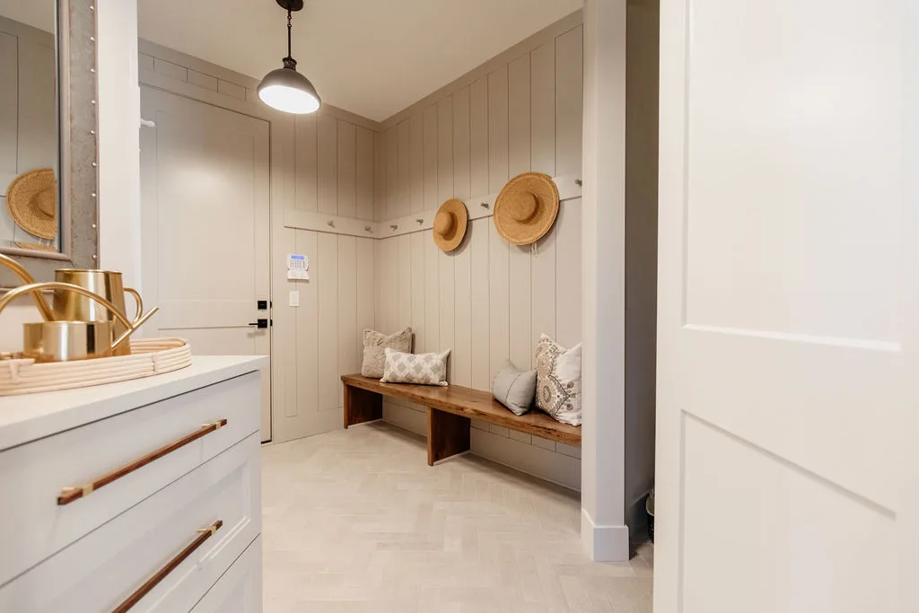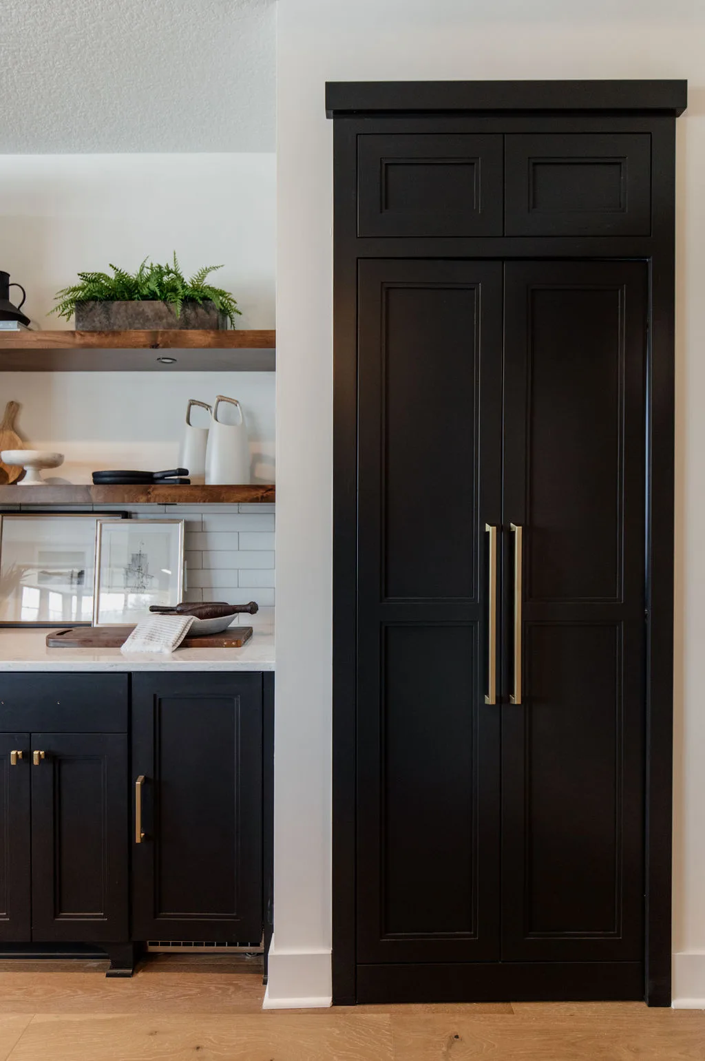 French oak floors flow through the main floor with a vaulted great room with beams, black windows, shiplap fireplace, and clean white walls.