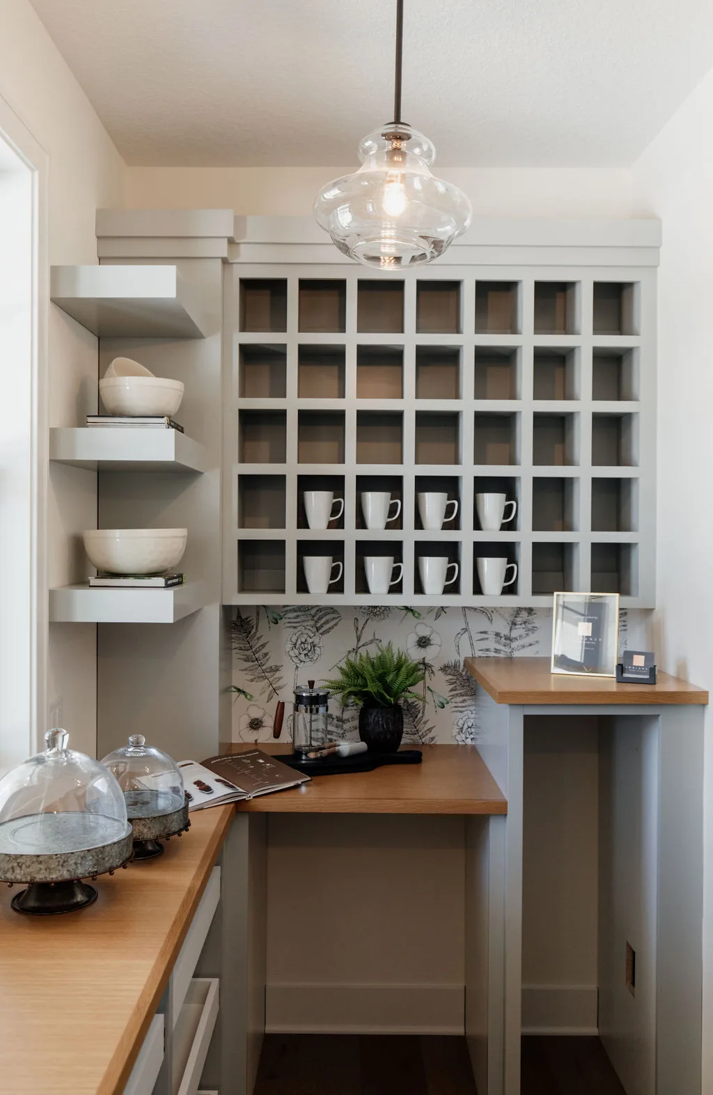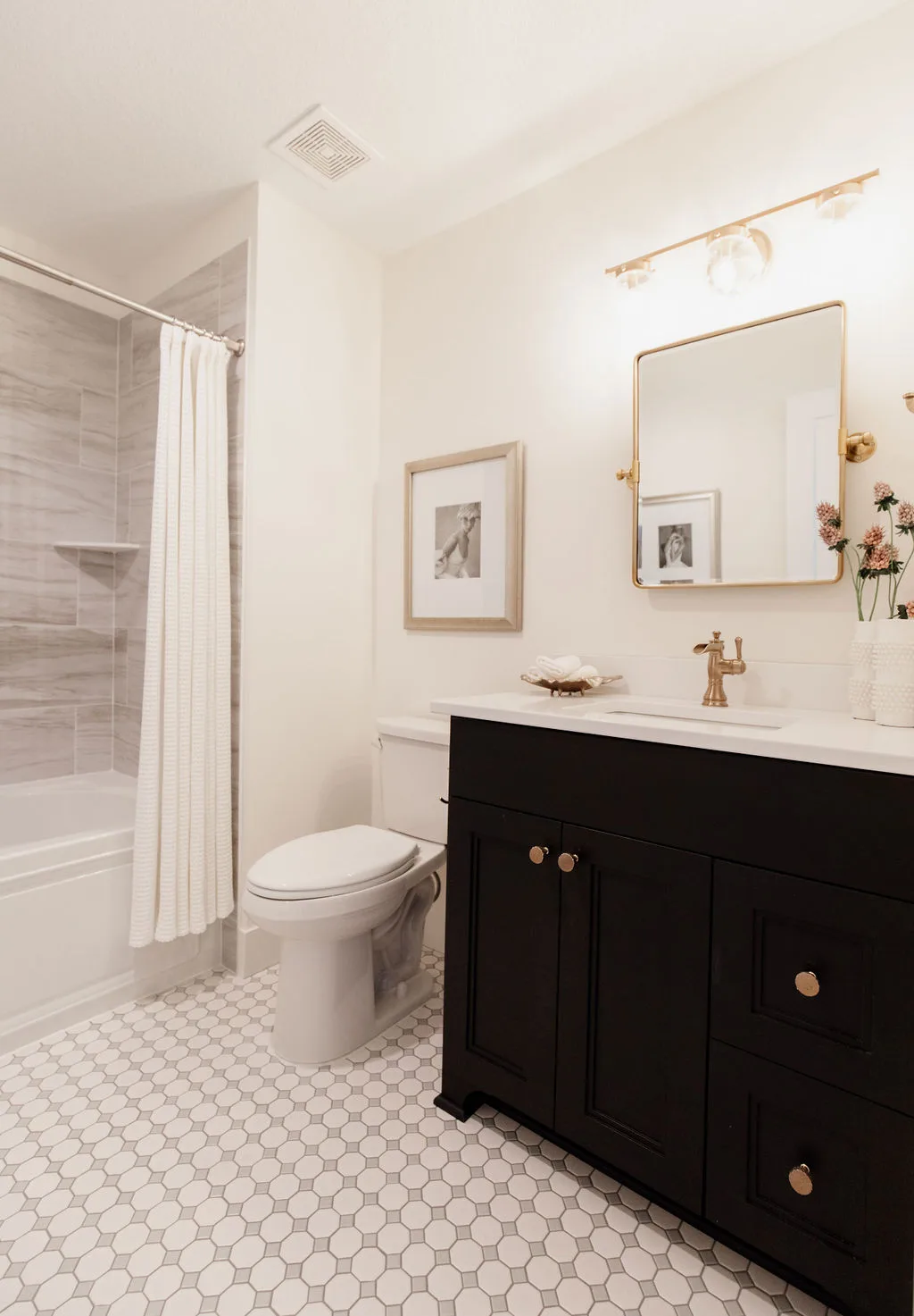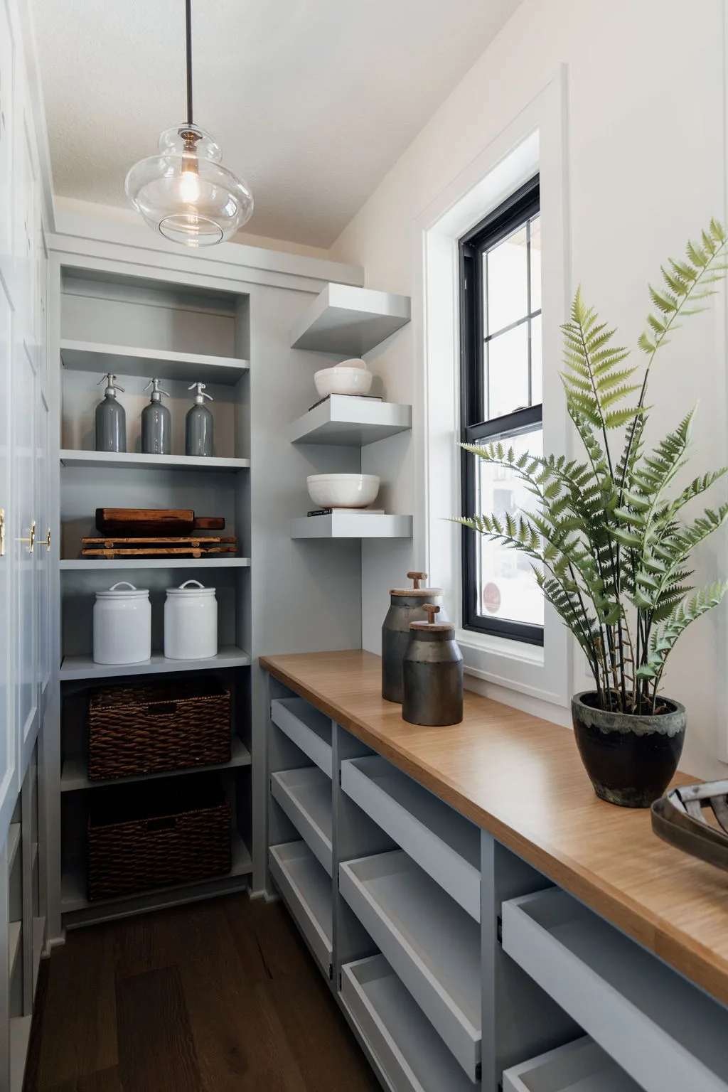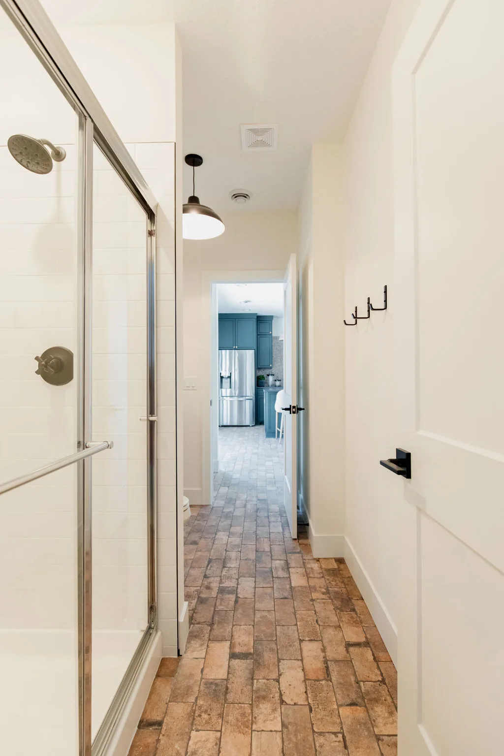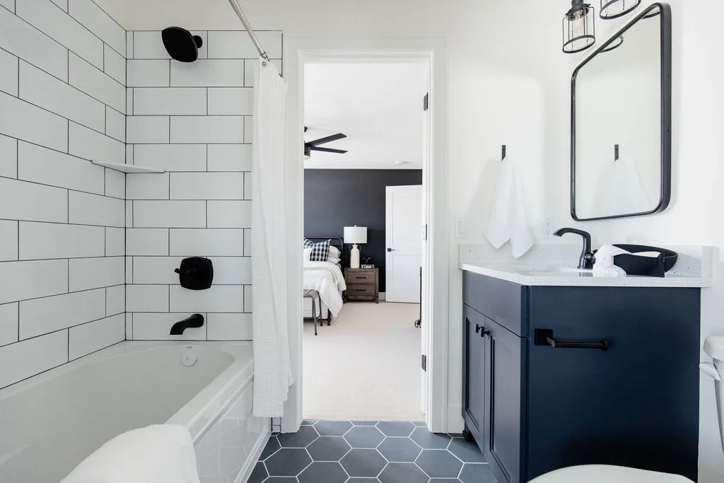 French oak floors flow through the main floor with a vaulted great room with beams, black windows, shiplap fireplace, and clean white walls.
