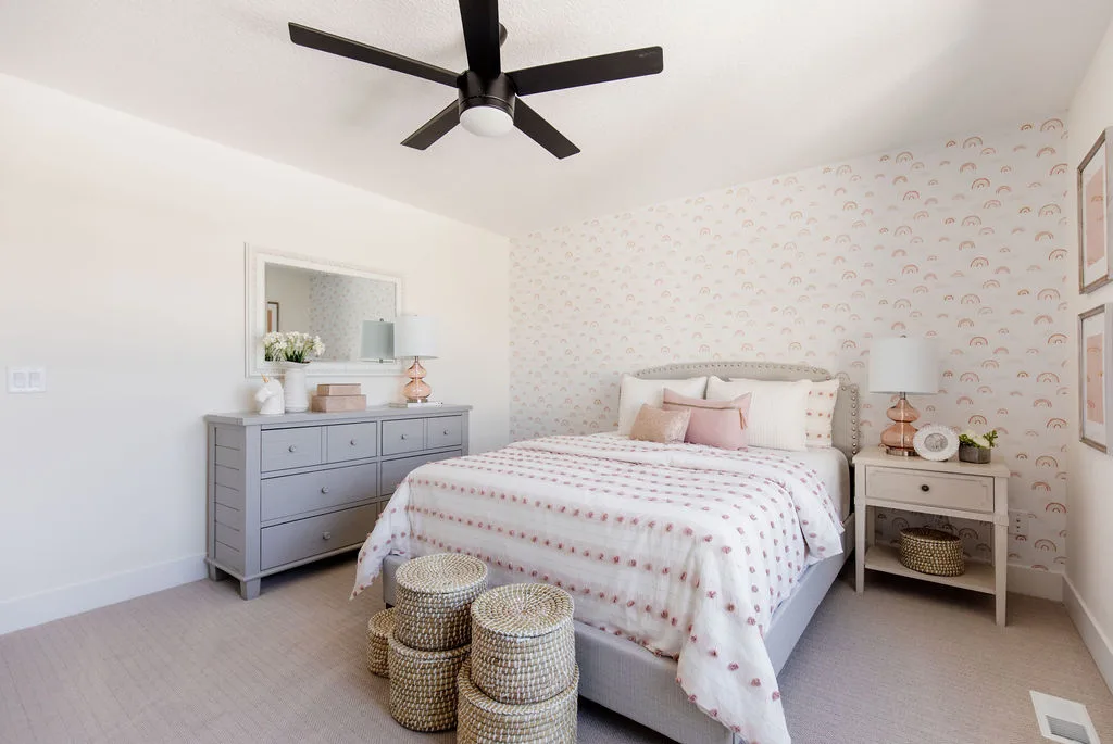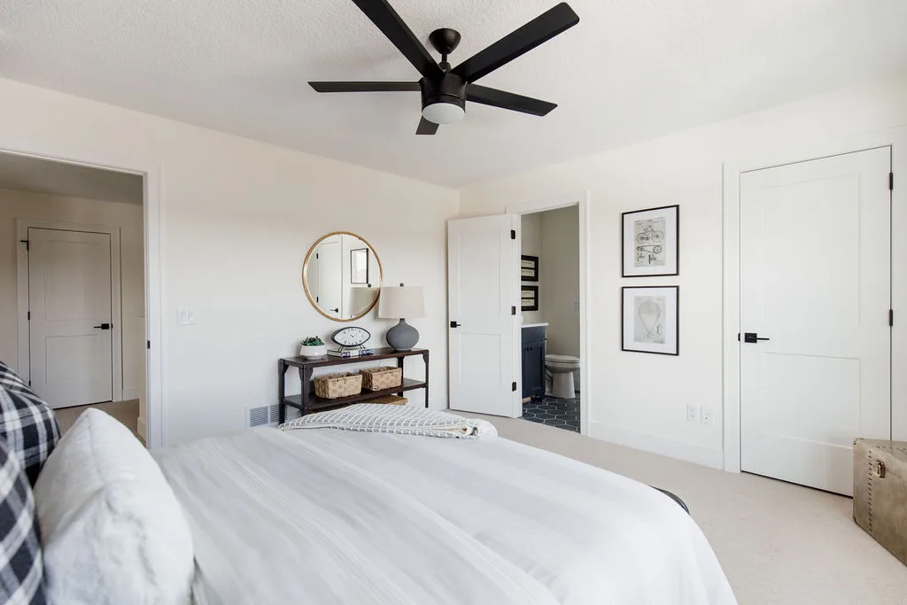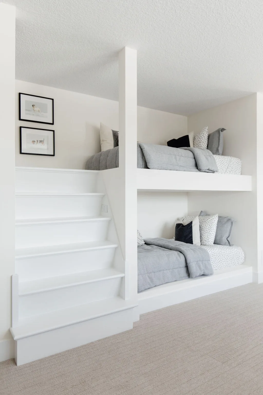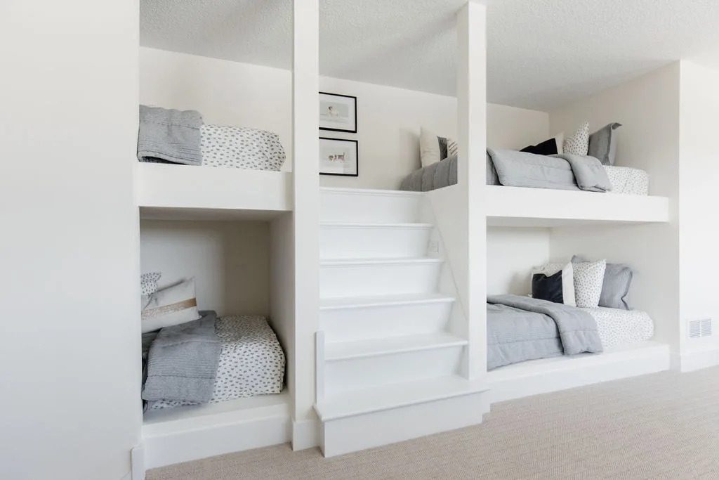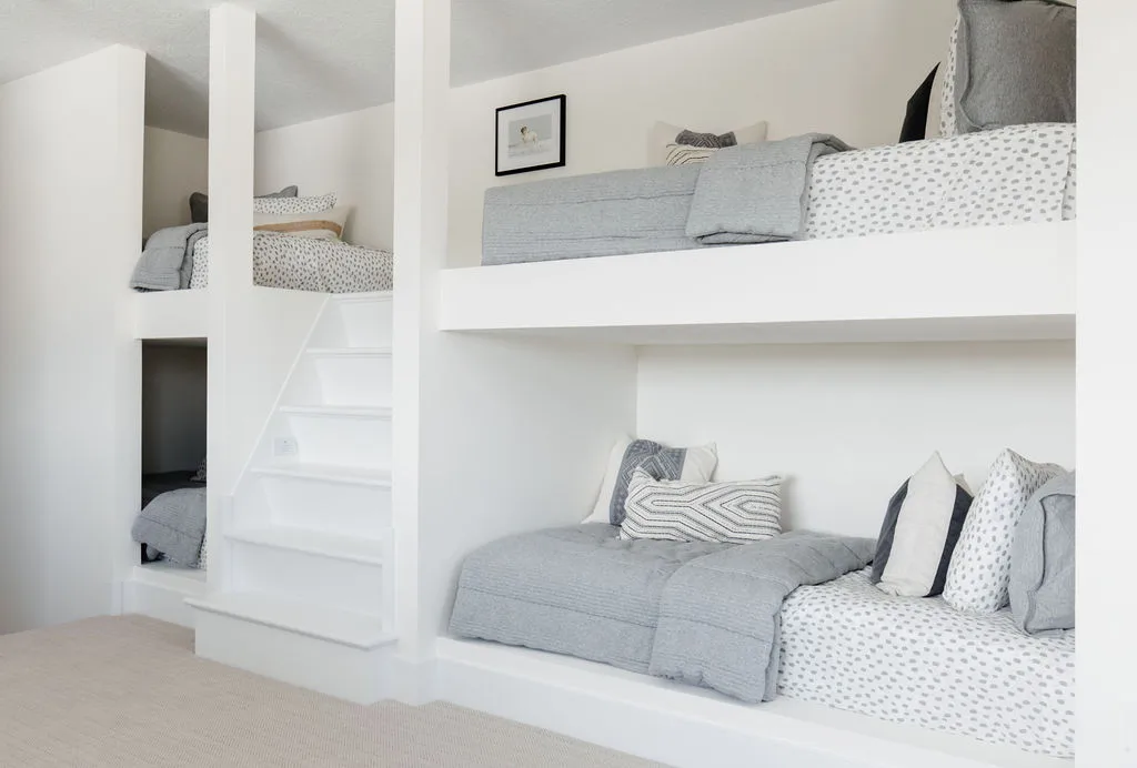 The central staircase with split landing leads to a bonus room with built-in bunks or sleeping quarters with 5 bedrooms including the vaulted primary suite with spa bath.