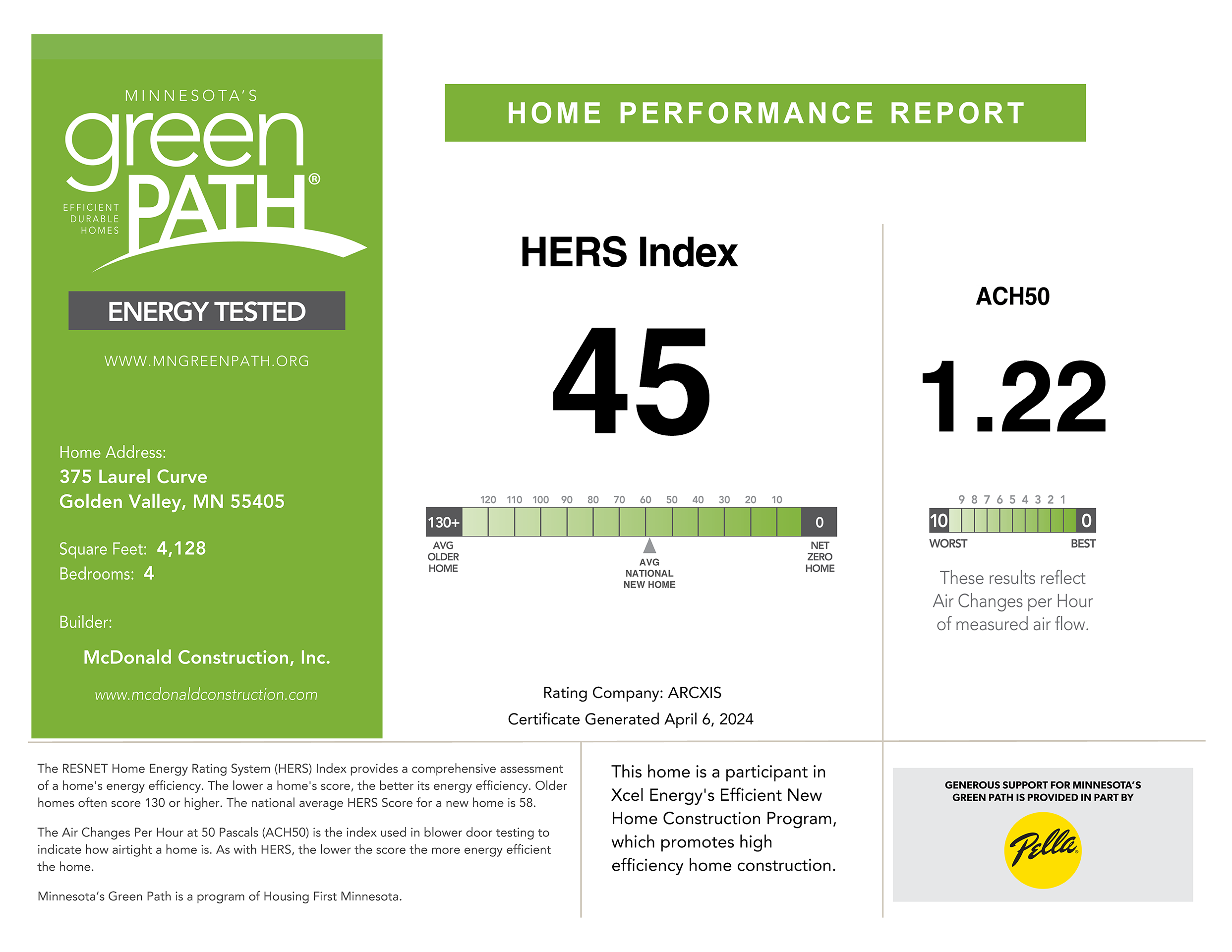 McDonald Construction is proud to be a Designated Builder in the MN Green Path™ program, a comprehensive approach to home building that prioritizes energy efficiency, resource conservation, and indoor air quality. Our MN Green Path™ certified homes undergo rigorous third-party testing and verification, achieving HERS ratings of 60 or below. Explore these homes for features, HERS ratings, and Green Path™ certification levels.